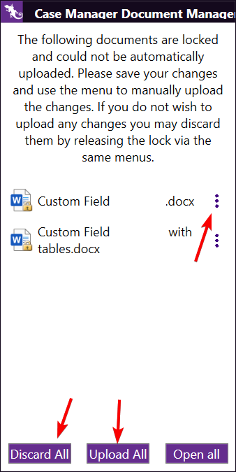 Here you have the option to either open the file on your device, discard any changes and release the lock, or upload any changes to the document, if any: