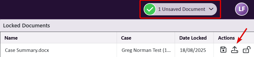 If your document is listed below, try uploading it by clicking the ‘Upload Document’ icon. You can also choose “Upload and Release Lock” if needed.